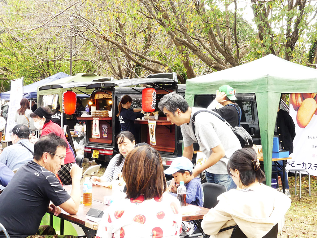 会場内では、野菜や果物、パン、おにぎりなどの販売に加え、キッチンカーも並び、多くの来場者でにぎわいました。